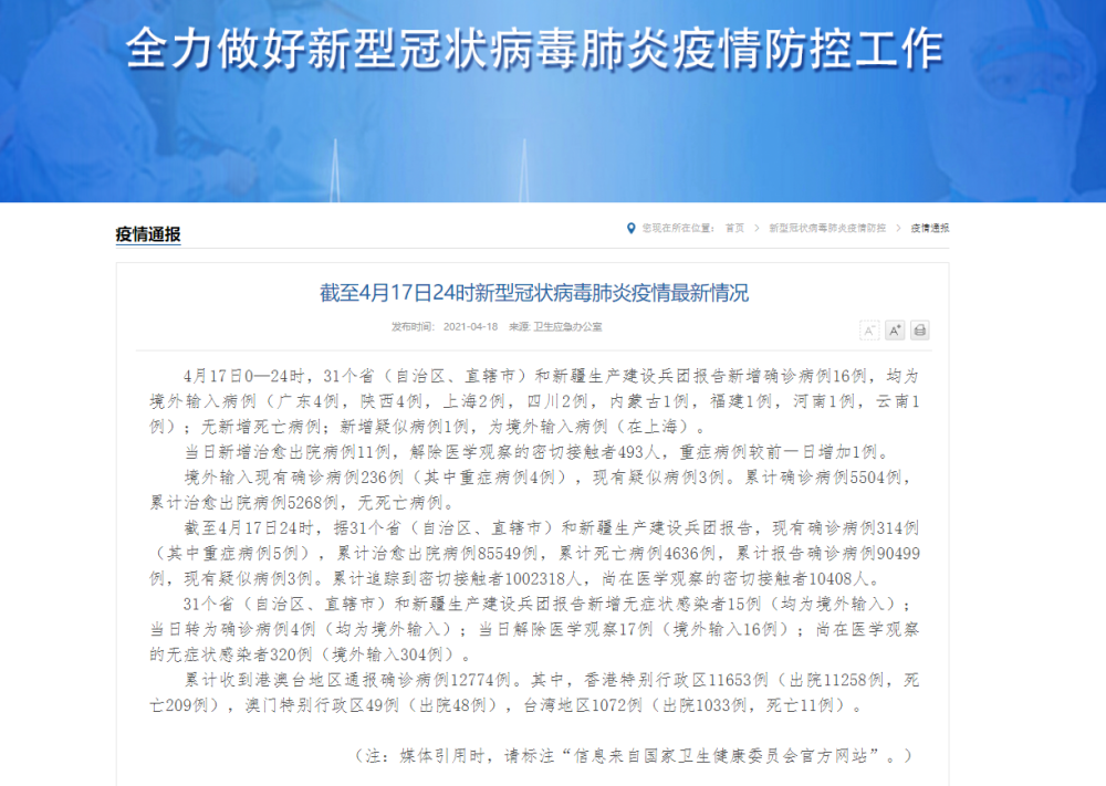 截至4月17日24时新型冠状病毒肺炎疫情最新情况 4月17日0—24时,31个省(自治区、直辖市)和新疆生产建设兵团报告新增确诊病例16例,均为境外输入病例(广东4例,陕西4例,上海2例,四川2例,内蒙古1例,福建1例,河南1例,云南1例);无新增死亡病例;新增疑似病例1例,为境外输入病例(在上海)。 当日新增治愈出院病例11例,解除医学观察的密切接触者493人,重症病例较前一日增加1例。 境外输入现有确诊病例236例(其中重症病例4例),现有疑似病例3例。累计确诊病例5504例,累计治愈出院病例5268例,无死亡病例。 截至4月17日24时,据31个省(自治区、直辖市)和新疆生产建设兵团报告,现有确诊病例314例(其中重症病例5例),累计治愈出院病例85549例,累计死亡病例4636例,累计报告确诊病例90499例,现有疑似病例3例。累计追踪到密切接触者1002318人,尚在医学观察的密切接触者10408人。 31个省(自治区、直辖市)和新疆生产建设兵团报告新增无症状感染者15例(均为境外输入);当日转为确诊病例4例(均为境外输入);当日解除医学观察17例(境外输入16例);尚在医学观察的无症状感染者320例(境外输入304例)。 累计收到港澳台地区通报确诊病例12774例。其中,香港特别行政区11653例(出院11258例,死亡209例),澳门特别行政区49例(出院48例),台湾地区1072例(出院1033例,死亡11例)。