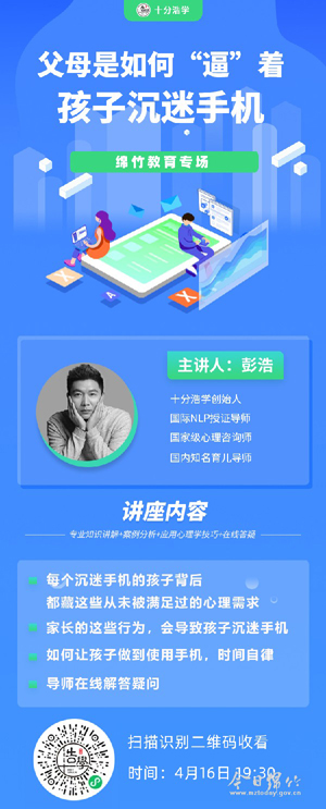 在如今电子时代,不少沉迷游戏的青少年同时伴随着厌学问题,致使很多家长认为手机等电子产品以及网络游戏是孩子厌学的罪魁祸首。大多数家长认为玩游戏既耽误学习时间又玩物丧志,只要孩子喜欢上它,就可能对学习造成影响。如何探知孩子沉迷手机游戏背后的秘密,激发孩子内在的学习驱动力?4月16日晚,绵竹市教育局特邀“十分浩学”创始人、国内著名育儿专家、国际NLP导师彭浩,为绵竹家长在线分享了以《父母是如何“逼”着孩子沉迷手机》为主题的家庭教育及应用心理学线上主题讲座。