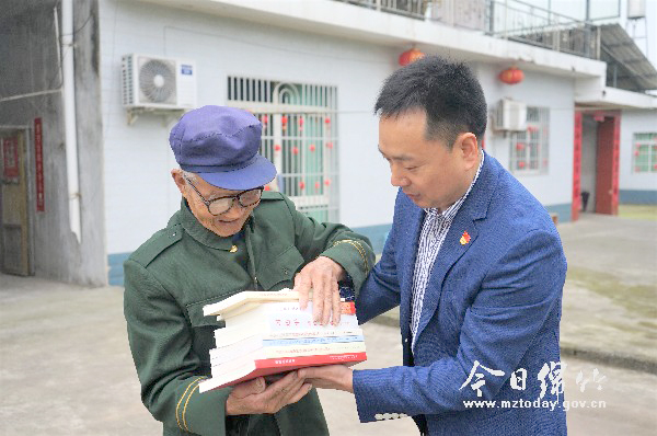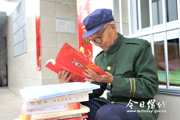 老人一边翻着书,一边念叨着。战争年代惊心动魄的烽火硝烟,充满艰难险阻的万里长征,红军三大主力会师井冈山的喜悦……介绍起自己珍藏的书籍,老人如数家珍。捧着工作人员送来的《共产党简史》《习近平新时代社会主义思想学习问答》等新书籍,老人如获至宝,爱不释手。聊党史,忆党恩,普通的农家小院里尽是欢声笑语。 据社区书记詹元生介绍,詹绍发当了6年兵,退伍回乡后担任过村里的民兵副连长,带着民兵们熬夜巡逻,守护一方平安。村里人都知道,老人爱看红色书籍,爱唱红歌,扫地做农活时常是唱着红歌,没事时就到社区的农家书屋借阅书籍,鼻梁上的镜片越来越厚,老人的日子也越来越充实。 临别依依,老人执意送到村道口,工作人员一个劲叮嘱他照顾身体,有事尽管开口。老人拍着胸脯说,人老心未老,多读书多学习,盼着有机会继续发挥余热。