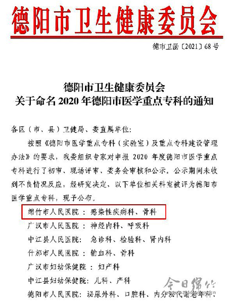 本刊消息 日前,德阳市卫生健康委员会公布《关于命名2020年德阳市医学重点专科的通知》,华西绵竹医院感染性疾病科、骨科被评为德阳市医学重点专科。截至目前,该院已有省级重点专科5个,市级重点专科12个。