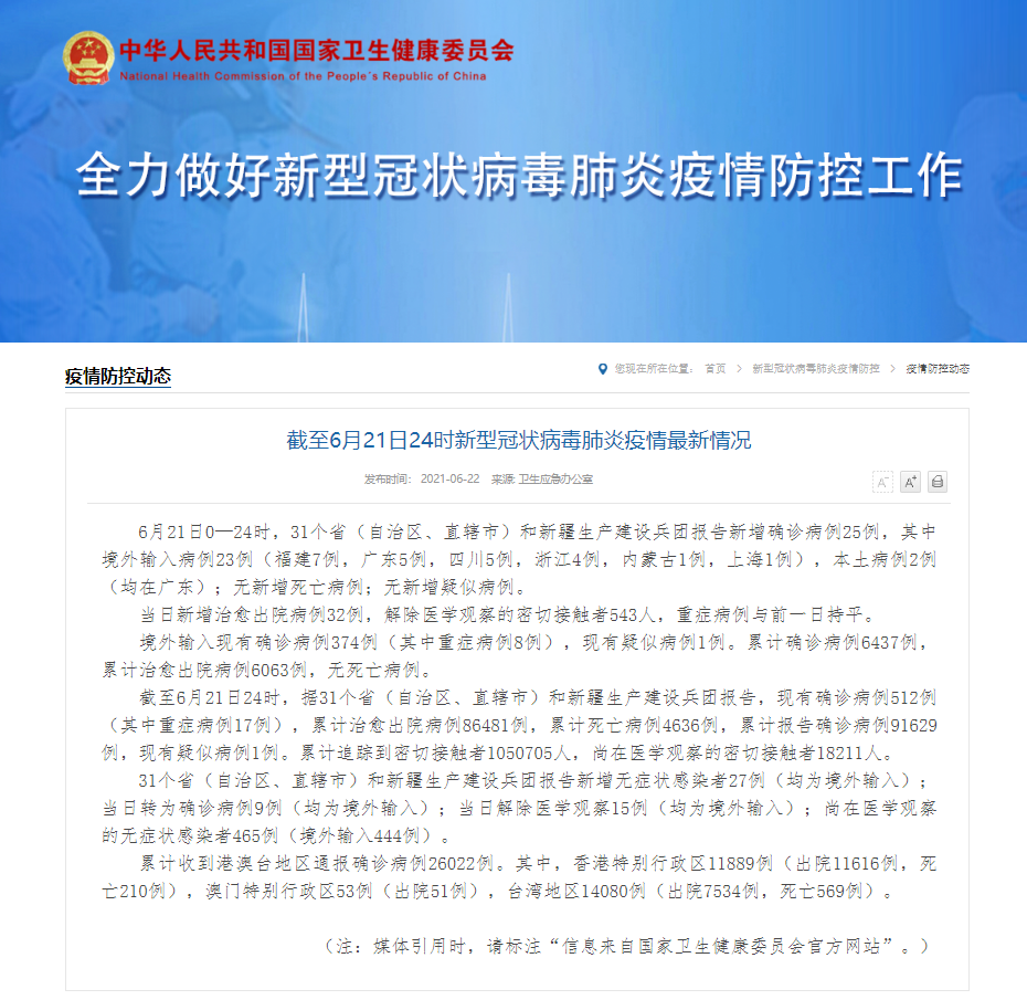 截至6月21日24时新型冠状病毒肺炎疫情最新情况 6月21日0—24时,31个省(自治区、直辖市)和新疆生产建设兵团报告新增确诊病例25例,其中境外输入病例23例(福建7例,广东5例,四川5例,浙江4例,内蒙古1例,上海1例),本土病例2例(均在广东);无新增死亡病例;无新增疑似病例。 当日新增治愈出院病例32例,解除医学观察的密切接触者543人,重症病例与前一日持平。 境外输入现有确诊病例374例(其中重症病例8例),现有疑似病例1例。累计确诊病例6437例,累计治愈出院病例6063例,无死亡病例。 截至6月21日24时,据31个省(自治区、直辖市)和新疆生产建设兵团报告,现有确诊病例512例(其中重症病例17例),累计治愈出院病例86481例,累计死亡病例4636例,累计报告确诊病例91629例,现有疑似病例1例。累计追踪到密切接触者1050705人,尚在医学观察的密切接触者18211人。 31个省(自治区、直辖市)和新疆生产建设兵团报告新增无症状感染者27例(均为境外输入);当日转为确诊病例9例(均为境外输入);当日解除医学观察15例(均为境外输入);尚在医学观察的无症状感染者465例(境外输入444例)。 累计收到港澳台地区通报确诊病例26022例。其中,香港特别行政区11889例(出院11616例,死亡210例),澳门特别行政区53例(出院51例),台湾地区14080例(出院7534例,死亡569例)。 网站截图 |