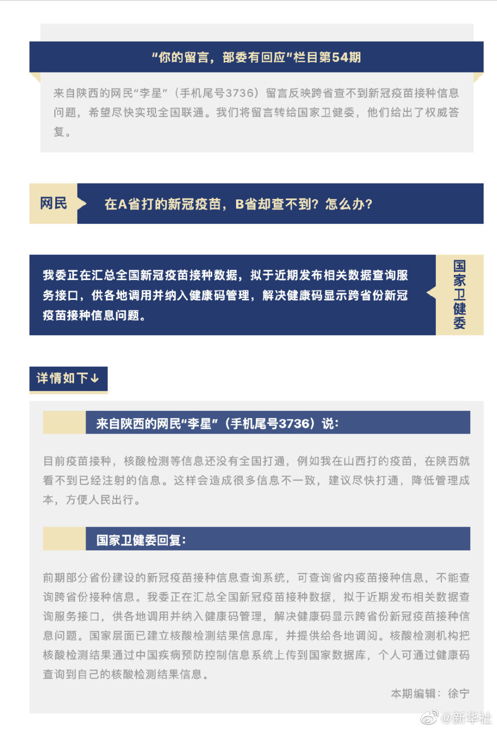 【国家卫健委拟发布跨省疫苗接种信息查询接口】据“中国政府网”微信公众号“你的留言,部委有回应”栏目22日消息,针对网友反映的部分省份无法查询跨省新冠疫苗接种信息问题,国家卫健委表示,前期部分省份建设的新冠疫苗接种信息查询系统,可查询省内疫苗接种信息,不能查询跨省份接种信息。国家卫健委正在汇总全国新冠疫苗接种数据,拟于近期发布相关数据查询服务接口,供各地调用并纳入健康码管理,解决健康码显示跨省份新冠疫苗接种信息问题。国家层面已建立核酸检测结果信息库,并提供给各地调阅。核酸检测机构把核酸检测结果通过中国疾病预防控制信息系统上传到国家数据库,个人可通过健康码查询到自己的核酸检测结果信息。