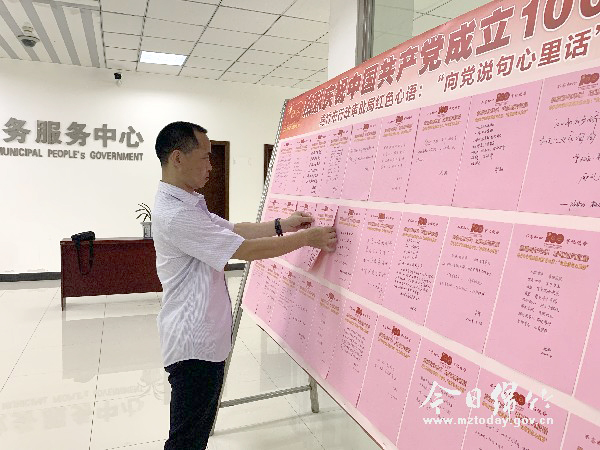 “历史的史册里,不能没有党的记忆;历史的长卷中,不能没有党的足迹。”“一百年艰苦奋斗,一百年跌宕起伏,祝福党生日快乐,开启新征程,开创新辉煌。”市行政审批局全体党员在党的百年华诞来临之际,写下一行行对党的心里话并张贴在展板上,表达对党的无限崇敬、热爱之情。