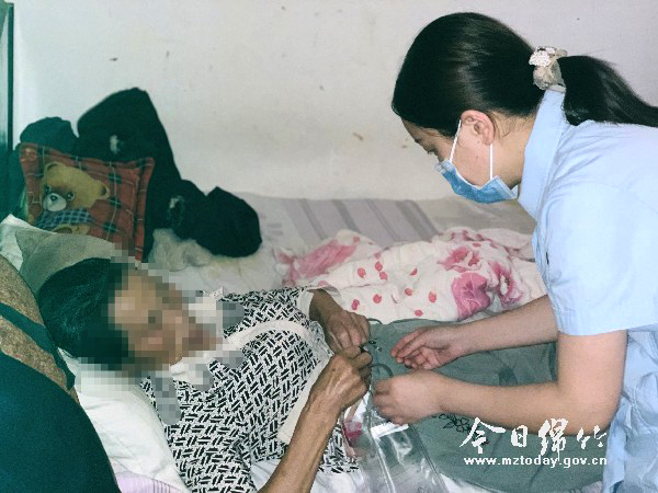 近日,市人民医院妇科护士陈佳怡、肖婷带着护理用具来到汉旺镇的张阿姨家,为前期已经“带管”出院的张阿姨更换尿袋。她们将优质护理延伸到患者家中,解决了患者出行不便的难题。