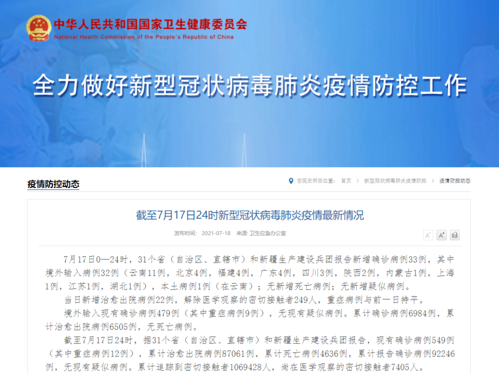 截至7月17日24时新型冠状病毒肺炎疫情最新情况 7月17日0—24时,31个省(自治区、直辖市)和新疆生产建设兵团报告新增确诊病例33例,其中境外输入病例32例(云南11例,北京4例,福建4例,广东4例,四川3例,陕西2例,内蒙古1例,上海1例,江苏1例,湖北1例),本土病例1例(在云南);无新增死亡病例;无新增疑似病例。 当日新增治愈出院病例22例,解除医学观察的密切接触者249人,重症病例与前一日持平。 境外输入现有确诊病例479例(其中重症病例9例),无现有疑似病例。累计确诊病例6984例,累计治愈出院病例6505例,无死亡病例。 截至7月17日24时,据31个省(自治区、直辖市)和新疆生产建设兵团报告,现有确诊病例549例(其中重症病例12例),累计治愈出院病例87061例,累计死亡病例4636例,累计报告确诊病例92246例,无现有疑似病例。累计追踪到密切接触者1069428人,尚在医学观察的密切接触者7405人。 31个省(自治区、直辖市)和新疆生产建设兵团报告新增无症状感染者27例(均为境外输入);当日转为确诊病例4例(均为境外输入);当日解除医学观察18例(均为境外输入);尚在医学观察的无症状感染者449例(境外输入444例)。 累计收到港澳台地区通报确诊病例27401例。其中,香港特别行政区11956例(出院11682例,死亡212例),澳门特别行政区55例(出院53例),台湾地区15390例(出院12207例,死亡764例)。