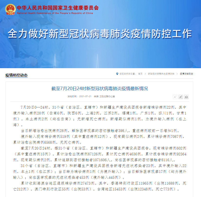 7月20日0—24时,31个省(自治区、直辖市)和新疆生产建设兵团报告新增确诊病例22例,其中境外输入病例20例(云南6例,陕西6例,上海2例,江苏2例,福建1例,广东1例,四川1例,甘肃1例),本土病例2例(均在云南);无新增死亡病例;新增疑似病例1例,为境外输入病例(在上海)。 当日新增治愈出院病例28例,解除医学观察的密切接触者398人,重症病例较前一日增加1例。 境外输入现有确诊病例519例(其中重症病例12例),现有疑似病例2例。累计确诊病例7087例,累计治愈出院病例6568例,无死亡病例。 截至7月20日24时,据31个省(自治区、直辖市)和新疆生产建设兵团报告,现有确诊病例602例(其中重症病例15例),累计治愈出院病例87126例,累计死亡病例4636例,累计报告确诊病例92364例,现有疑似病例2例。累计追踪到密切接触者1071606人,尚在医学观察的密切接触者8116人。 31个省(自治区、直辖市)和新疆生产建设兵团报告新增无症状感染者23例,其中境外输入22例,本土1例(在江苏);当日转为确诊病例1例(为境外输入);当日解除医学观察17例(均为境外输入);尚在医学观察的无症状感染者453例(境外输入445例)。 累计收到港澳台地区通报确诊病例27473例。其中,香港特别行政区11965例(出院11688例,死亡212例),澳门特别行政区55例(出院53例),台湾地区15453例(出院12348例,死亡773例)。