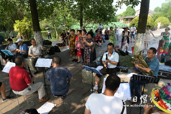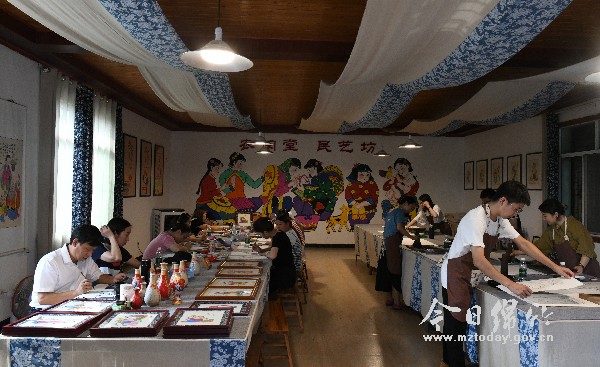 这是当地群众利用农闲时间在绘制年画产品、游人在这里演奏曲目的场景。