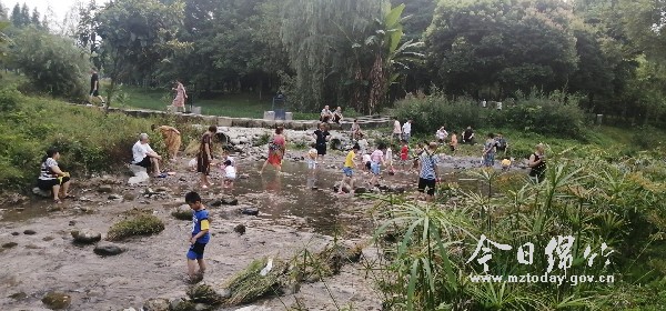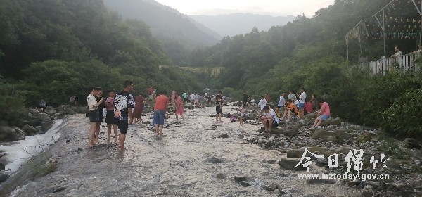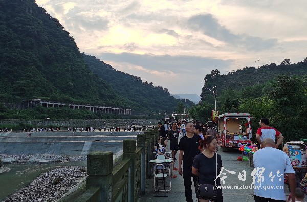 “杨家院子位于九龙里和花厢之间,打造时保留了原有特色,新增了多个小景点,乡村面貌焕然一新。”在村民王天清的眼里,昔日里名不经传的小村庄,经过深度挖掘和艺术包装,焕发出异样光芒,吸引了无数游人前来休闲游玩、避暑纳凉。 麻柳坪坐落于白云山下,山间飘浮着雾气,宛若人间仙境。沿着石子路漫步到山谷里,刚走近戏水区,耳畔便传来连绵不绝的蝉鸣。抬头远望,枝繁叶茂的老树撑起无数把“大伞”,投下片片阴凉,上百名游人赤足踩在水里,尽情地嬉戏打闹。 河岸旁,售卖小吃的摊贩一字排开,引得无数游人吹着清凉的夜风大快朵颐。“山中品美味,日子赛神仙。”每天晚饭后,家住汉旺镇的李艳都会约上几个朋友来这里消暑纳凉。