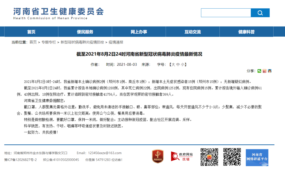 截至2021年8月2日24时河南省新型冠状病毒肺炎疫情最新情况 2021年8月2日0时-24时,我省新增本土确诊病例2例(郑州市1例、商丘市1例);新增本土无症状感染者15例(郑州市15例);无新增疑似病例。 截至2021年8月2日24时,我省累计报告本地确诊病例1288例,其中死亡病例22例,出院病例1251例,现有住院病例15例。累计报告境外输入确诊病例61例,43例出院,18例在院治疗。累计追踪到密切接触者41756人,尚在医学观察的密切接触者369人。 河南省卫生健康委提醒您: 戴口罩,人群聚集处需格外注意;勤洗手,避免用未清洁的手接触口、眼、鼻等部位;常通风,每天开窗通风不少于2-3次;少聚集,减少不必要的聚会、聚餐,公共场所要保持一米以上社交距离;使用公勺公筷,餐具用后要消毒。 特别是做核酸检测,要戴好口罩,保持一米线,做好配合;主动接种新冠疫苗,配合社区开展流调、采样。 科学就医,有发热、干咳、咽痛等呼吸道症状要及时就近就医。