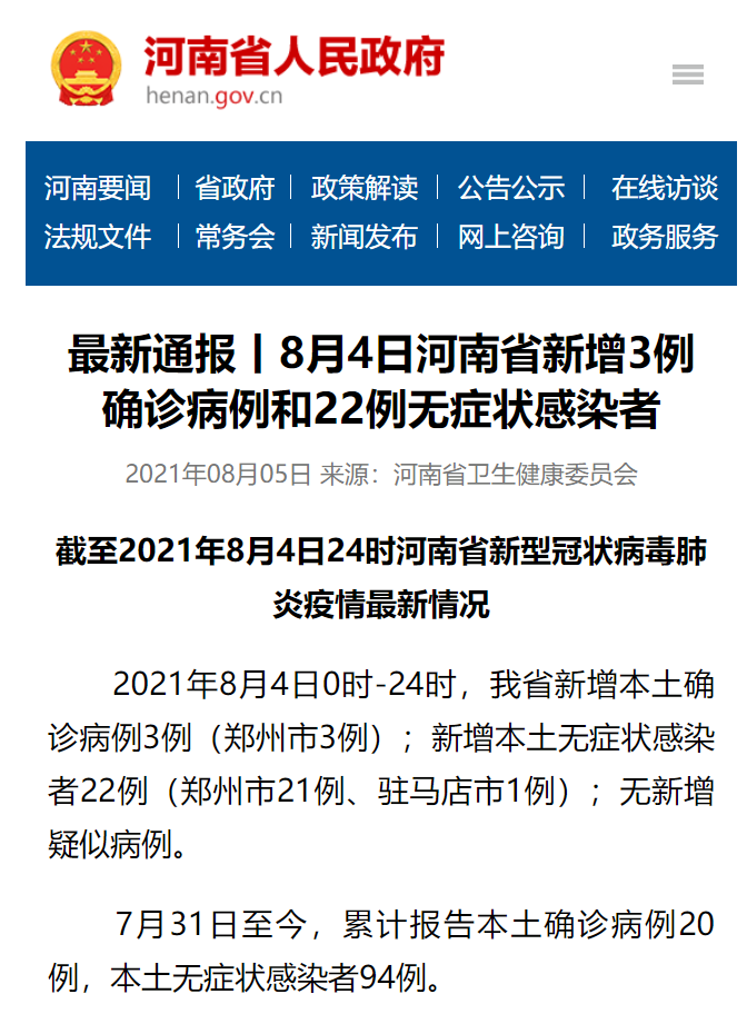 截至2021年8月4日24时河南省新型冠状病毒肺炎疫情最新情况 2021年8月4日0时-24时,我省新增本土确诊病例3例(郑州市3例);新增本土无症状感染者22例(郑州市21例、驻马店市1例);无新增疑似病例。 7月31日至今,累计报告本土确诊病例20例,本土无症状感染者94例。 截至2021年8月4日24时,我省累计报告本地确诊病例1293例,其中死亡病例22例,出院病例1251例,现有住院病例20例;累计报告境外输入确诊病例62例,44例出院,18例在院治疗。我省正在医学观察的无症状感染者123例(本土94例、境外输入29例)。 自2020年1月21日起,累计追踪到密切接触者42298人,尚在医学观察的密切接触者822人。 河南省卫生健康委提醒您: 戴口罩,人群聚集处需格外注意;勤洗手,避免用未清洁的手接触口、眼、鼻等部位;常通风,每天开窗通风不少于2-3次;少聚集,减少不必要的聚会、聚餐,公共场所要保持一米以上社交距离;使用公勺公筷,餐具用后要消毒。 特别是做核酸检测,要戴好口罩,保持一米线,做好配合;主动接种新冠疫苗,配合社区开展流调、采样。 科学就医,有发热、干咳、咽痛等呼吸道症状要及时就近就医。 ↑网站截图