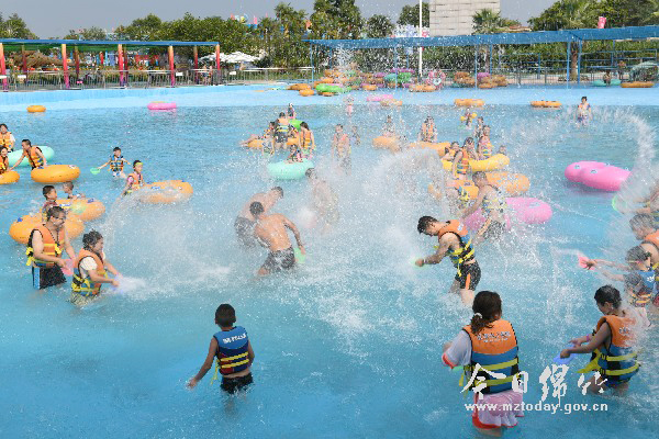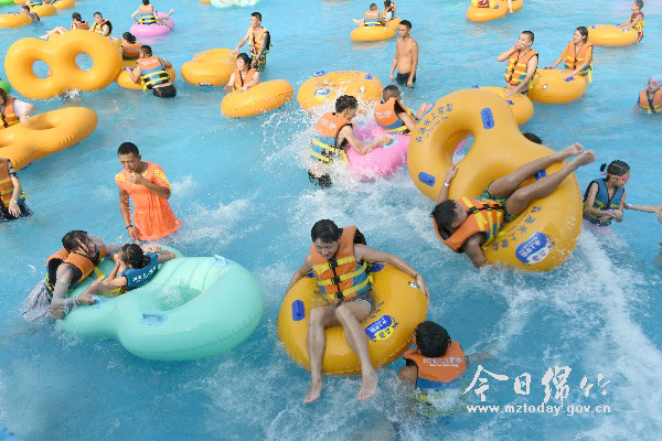 连日来,四川多地发布高温橙色预警,大多市民选择就地、就近休闲避暑,感受夏日清凉。图为8月4日,众多游客在位于新市镇剑南春森林公园的森海水上乐园冲浪池戏水的情景。