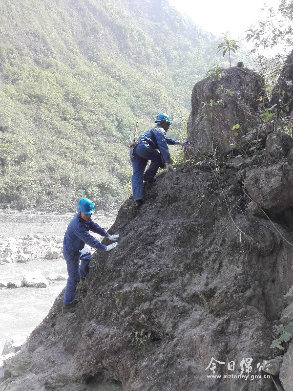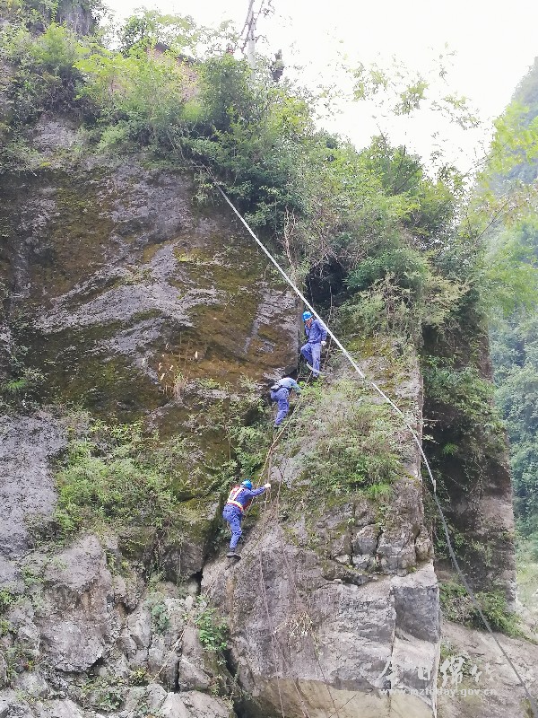 “今天的任务是巡视10千伏徐东路和10千伏徐兰路,高温天干活,最大的挑战是体力不支,容易中暑。为了能够避开酷热,清晨早点出发。”所长魏建分配了当天的工作任务后,还特别提醒大家野外操作的注意事项。 绵茂公路起于绵竹,穿越九顶山,止于茂县,全长56公里,10千伏徐兰路与10千伏徐东路是为绵茂公路施工提供用电的线路。两条线路共有62基电杆,均在海拔1400多米的山上,因为山势陡峭、地理位置狭窄等原因,每次巡视这两条线路都需要攀崖壁、钻山洞、趟水过河、开辟山路。 乘车来到10千伏徐东路山脚下,魏建和同事一行开始徒步巡线。“慢点,慢点,大家站稳脚跟,放低重心,互相搭把手,注意安全。”魏建一边叮嘱,一边不停地用登山杖击打茅草。“动静越大越好,用力打草,就是为了惊蛇。”他说,上山巡线,遇蛇遭虫是常有的事。