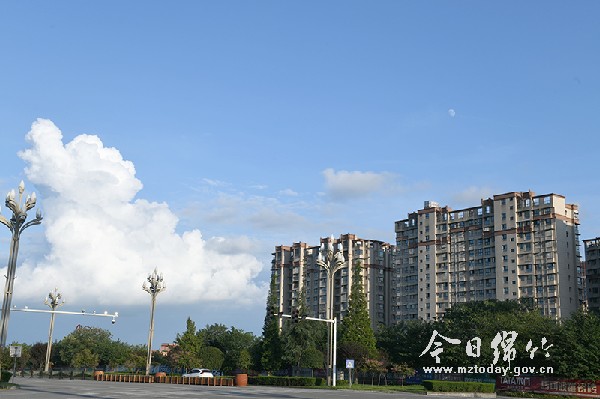 8月18日,雨后的绵竹空气清新,碧空如洗,蓝天、白云、远山、月亮组成一幅诗情画意的场景。一轮盈凸月挂在蓝色的苍穹下,异常美丽,再现了歌词中描绘的“天上云追月,地下风吹柳”场景。图为记者在绵竹新城拍摄的一组图片。