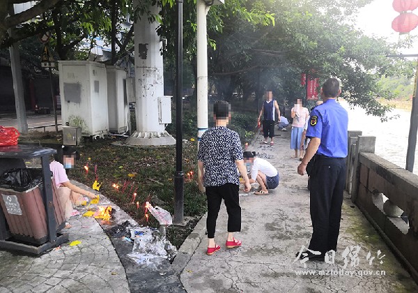 中元节即将来临,为进一步营造文明、和谐、清洁、有序的城市环境,巩固疫情防控成果,推进移风易俗、倡导文明祭祀理念,市城管执法人员加强巡查,对在公共场所焚烧祭祀用品的不文明行为进行劝导。