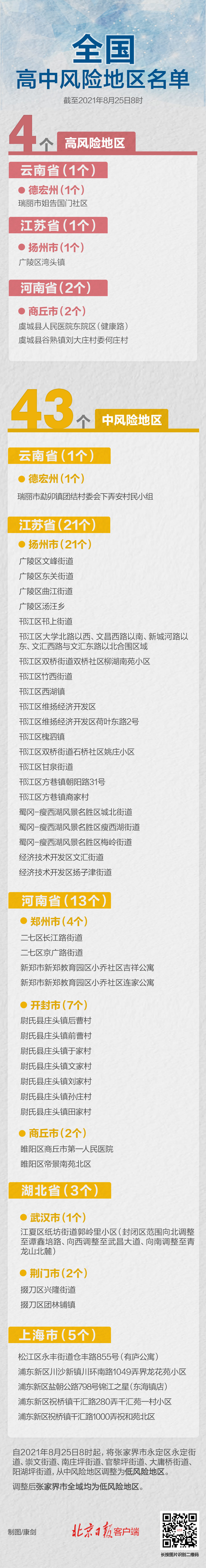 自2021年8月25日8时起,湖南省张家界市永定区永定街道、崇文街道、南庄坪街道、官黎坪街道、大庸桥街道、 阳湖坪街道,从中风险地区调整为低风险地区。调整后张家界市全域均为低风险地区。 目前,全国现有高风险地区4个、中风险地区43个。