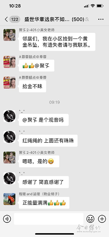 原来,一天前,付华因聚会晚归,第二天睡醒才发现金吊坠遗失。“当时发现丢了之后,我对能否找回没有抱太大希望,毕竟是十几克的纯金,而且已经丢了一天了。”付华说,当天上午9点40分,张聚和她在小区门口碰头,并向她返还吊坠。当时她着急去办事,也没有好好感谢她,但这个事情让她感觉到很温暖,尤其是大家又住在一个小区,原来好人一直都在我们身边。 (图由热心市民提供)