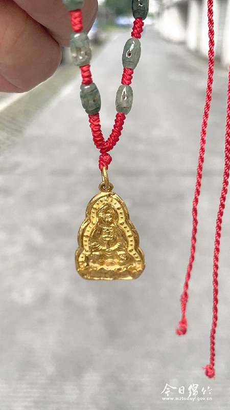 8月27日上午8点过,盛世华章小区住户张聚和老公外出买菜,刚出门没多久,便看到小区的路边躺着一个金色的观音吊坠。张聚说:“我当时想这是不是金子做的哦,就让老公把它捡起来,一看果然是黄金的。” 张聚心想失主遗失了贵重之物,肯定心急,再加上吊坠落在小区里,失主估计也是小区的住户,她就在小区业主群里发布了招领公告。很快,张聚便得到了回应,失主是小区住户付华。
