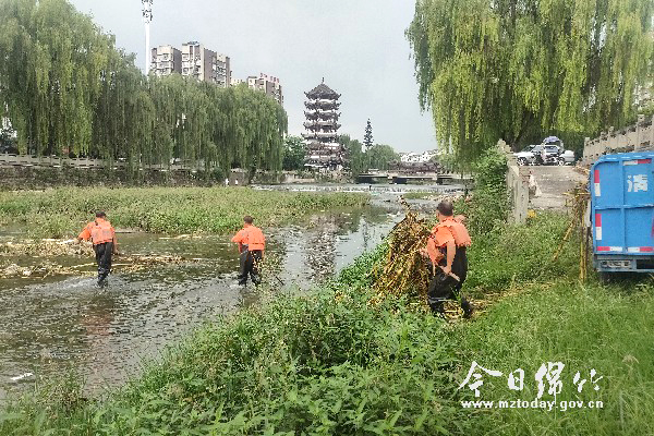 记者在该市民提供的视频中看到,在马尾河北门花桥段,4名环卫工人穿着救生衣和水裤浸泡在河水中,手中拿着竹竿正在将河道里漂浮的秸秆推向下游方向顺流而下......“这样就把河道清理了?这些垃圾是不是就顺着河流漂走了?”该市民路过此处时录下视频,十分不解。 随后,记者沿着马尾河城区段走了一圈果然看到,在下游河床较宽的马尾河紫东桥段,环卫工人正在对秸秆进行打捞,而岸上已经堆满了打捞上来的秸秆。“这段时间正值秋收,河道里漂浮的大部分是秸秆,我们每天都在河道里忙碌。”正在清理秸秆的环卫工人廖昌德告诉记者,他从事河道清理工作已经多年,这样的情况每年都会出现,也是他们最为忙碌的时候,每天有五六个小时都浸泡在河水中。 市综合执法局环卫所工作人员告诉记者,采取在上游将堵塞在河道内的秸秆用竹竿勾开,顺河水向下游漂流到河床较宽的地方进行集中打捞,这样运输车辆也能够下河进行运输,既提高了工作效率,同时也减轻了环卫工人的劳动强度。 近年来,随着环境整治工作不断加强,绵竹城市环境面貌不断提升,而碧波荡漾、花开成行的马尾河无疑是城区最美丽的风景。市综合执法局在此呼吁广大市民,保护环境,人人有责。希望广大市民积极行动起来,自觉参与河道保洁工作,严禁向河中倾倒垃圾和抛弃杂物,让母亲河变得更加水清景美。
