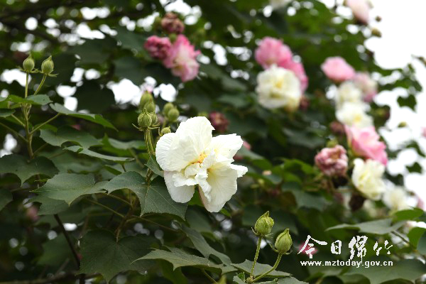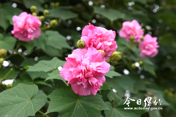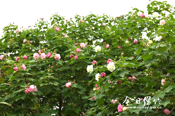 深秋时节,芙蓉花盛开。远远看去,一片浪漫粉色袭来,灿烂如锦,绚烂如霞,美不胜收。