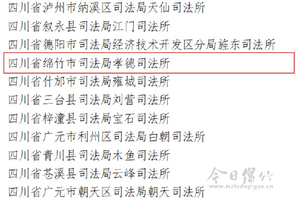 10月29日,司法部官网发布《关于表彰全国模范司法所和全国司法所模范个人的决定》,授予597个司法所“全国模范司法所”称号,授予796名同志“全国司法所模范个人”称号。其中,绵竹市孝德司法所获得“全国模范司法所”称号。 |