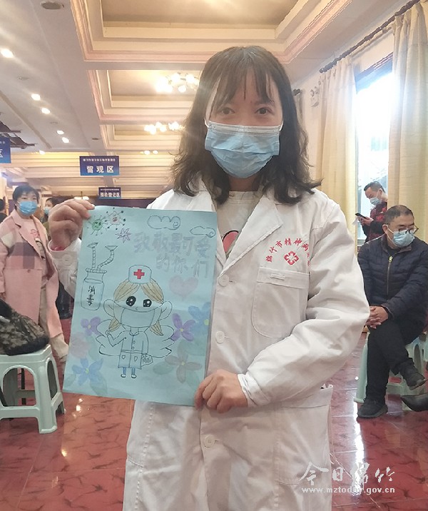 11月4日,我市3至11岁人群疫苗接种工作全面开启。针对这一特殊群体,接种现场的医护“绝招”频出,花式“哄娃”,快速有序推动儿童疫苗接种工作。这些有爱的医护们默默地付出,让一个个小小的心灵得到安抚,成为了孩子们的“大朋友”。11月8日,在剑南街道原市委党校3至11岁人群疫苗接种点,医护们就收到了来自小朋友的暖心礼物。 这份冬日里的暖心礼物是一张蜡笔画,最上方用蜡笔写着“致敬最可爱的你们”。鲜花丛中,穿着白大褂的医护背后有着一对大大的白色翅膀,就像来到人间的天使。她右手握拳,比出加油的手势,一旁,在消毒液的喷洒下,病毒痛苦扭曲。画面线条简单,却是医护人员白衣执甲、一线“战斗”最真实的反映。 接到这份暖心礼物的是市第三人民医院普通精神病三科医生卢美羽。当时,她正在预检分诊台忙碌,突然听到一声脆生生的“阿姨”,她立即微笑转头,一张蜡笔画便摆在她的眼前。小朋友说,“叔叔阿姨辛苦了,我会勇敢打针,健健康康的,希望把这张画送给所有医护人员。” 卢美羽说,那一刻分诊台周围很多医护都为之动容,大家的心里暖暖的。 |