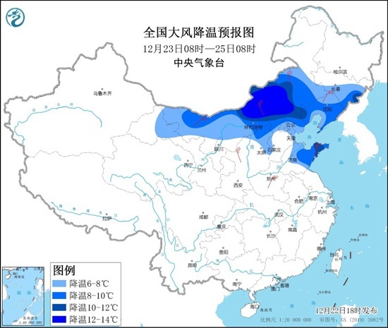 预计,12月23日至24日,淮河以北大部地区先后有4~5级风,阵风6~8级;内蒙古中西部、华北北部、东北地区南部、黄淮东部等地气温下降6~10℃,其中,内蒙古中部部分地区降温12℃以上。
