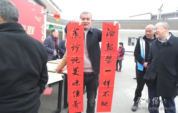 “‘油盐酱一样不缺,蒸炒炖美味佳肴’,老师,帮我写这一副,我要贴在厨房,跟其他人的不一样!”围观的一个群众高兴地向书法老师说道。活动现场,书法老师们挥毫泼墨,全神贯注地压纸、沾墨、起笔、收笔,一起一落之间,篆、隶、行、楷、草等多种书体各显神韵,笔笔生辉,一副副大红春联完美呈现,围观群众手捧春联开心不已。