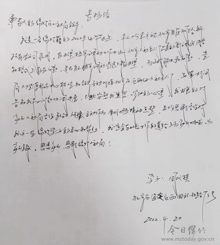 近日,市人社局收到一封特别的信件,远在北京的学子周代棋对该局工作人员全心全意、尽职尽责为民服务的精神表示衷心感谢。 原来,绵竹籍2022级应届毕业生周代棋因被北京百度网络科技有限公司录用,在办理人事档案调动工作时,由于北京人社部门出具的商调函内容和格式上存在问题,造成其档案调动在绵竹迟迟不能办理。为及时解决问题,绵竹市人力资源服务中心工作人员多次主动对接北京市、海淀区两级人社部门,通过电话咨询、问题反馈和信访渠道协调解决方法,最终解了周代棋求职路上的燃眉之急。 今年以来,市人社局以深化作风纪律建设为抓手,以打造“温暖人社”“满意人社”为目标,精准发力化解企业群众难点、堵点、痛点问题,以实际行动践行“以人为本”的服务理念,推动人社工作高质量发展。 |