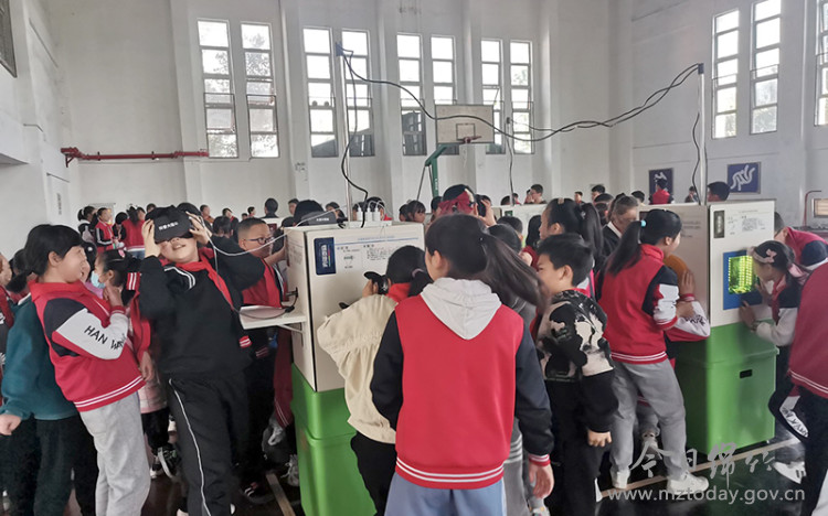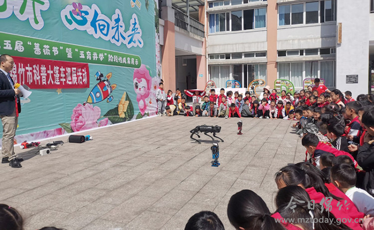 活动现场热闹活跃。同学们分年级在老师的组织下到活动区域有序参观、体验,展出的机器狗、机器人、VR眼镜等科普展品让同学们流连忘返。以往只能在科技馆里才能看到、听到、摸到的科普展品,送到了孩子们的身边,让他们可以“零距离”参与体验。活动现场5位同学还作为代表,与机器人进行了俯卧撑比赛。