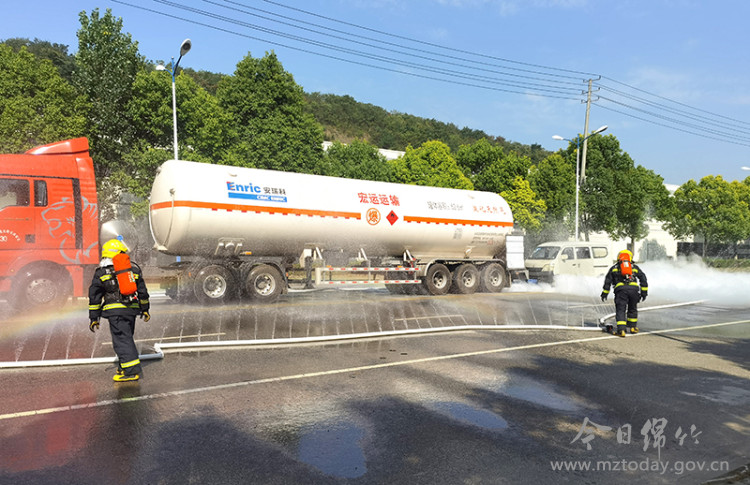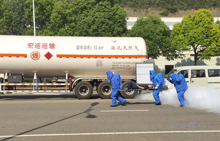 7月7日上午,德阳市“守护·2022”综合应急演练LNG槽车泄漏处置救援演练在我市举行。 演练模拟上午9点,一辆LNG槽罐车在行驶至绵竹市江苏工业园区玉妃路南段时,被一辆面包车追尾,事故造成槽车LNG低温液体大量泄漏。槽罐车驾驶员在关阀处理无效后报警,绵竹市消防救援大队快速出动,同时绵竹市政府启动危化品事故处置预案。绵竹市消防救援大队到场后立即设置警戒,禁绝火源,开展灾情侦察,掌握了解灾情情况,进行视频连线。市级相关职能部门应急、公安、卫健、环境、气象、供电等依次到场。交警在外围拉起警戒带,阻止无关人员和车辆进入现场;消防人员则实施水幕喷射,驱散和降低LNG泄漏蒸汽云浓度,防止火灾发生。与此同时,穿戴着防冻服的三名救援人员携带担架进入事故现场救援昏迷的面包车司机;德阳市消防专家、德阳市危化专家以及中京燃气公司技术人员对槽车泄漏部位、泄漏量、罐体压力、罐内剩余液化天然气数量等进行综合分析研判;两名危化品处置专业队消防救援人员与燃气公司技术人员穿着防冻服、佩戴正压式空气呼气器进入现场,使用堵漏木塞和浸湿绑带进行堵漏作业。最后的倒罐结束后,经可燃性气体检测仪检测,现场可燃气体浓度降至合格标准,险情成功排除。
