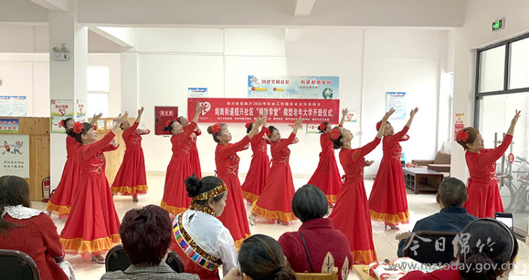 开班仪式上,剑南街道工作人员向大家详细介绍了“银龄学堂”微项目的背景与意义,并号召各位居民积极参加到老年大学中来,丰富业余文化生活。同时,剑南街道檀兴社区艺术团进行了文艺展示,带来了舞蹈《我和我的祖国》《新疆舞》《格桑拉》,诗朗诵《尊敬的老年人》,情景剧表演《父亲》等精彩的节目。