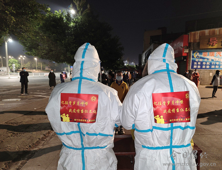 11月20日晚上,市退役军人事务局综合股工作人员胡勇穿戴好防护设备,来到一临时管控小区进行值班值守。由于正值冬季,夜晚十分寒冷,胡勇披着一件军大衣,一直从晚上10点钟坚守到第二天早上6点。
