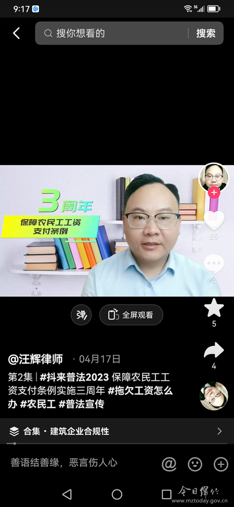 “为什么实行农民工劳动用工实名制管理?” “农民工工资被拖欠后如何维权?”点开市人社局工作人员汪辉的抖音号、微信视频号,《劳动法》《劳动合同法》《劳动争议调解仲裁法》《中华人民共和国民法典》《保障农民工工资支付条例》等法律法规一目了然,不少网友在线上进行互动,工作人员耐心细致地解答网友在劳动用工维权过程中遇到的法律问题,得到了一致好评。 据悉,市人社局在前期创新推出农民工服务保障政策电子书,切实方便建筑单位、农民工兄弟通过手机端线上及时查阅、实时学法的基础上,又抽调“精兵强将”参与普法宣传文案创作,聚焦群众喜闻乐见、通俗易懂、寓教于乐的宣传载体和形式,在抖音、西瓜视频、今日头条开辟“《条例》实施三周年”专栏普法,不断拓宽宣传覆盖面,增强全社会学法、尊法、守法、用法意识。同时,在监察仲裁大厅LED屏实时更新普法学习宣传内容,发放宣传资料和现场答疑解惑,营造浓厚的普法氛围。截至目前,“两职律师”(公益律师+公职律师)通过移动终端录制根治欠薪、涉疫劳动关系、劳动理论等普法宣传视频520余个,播放量达30万余次。 下一步,市人社局还将充分发挥在根治欠薪工作中的牵头作用,加强统筹调度,组织成员单位形成合力,明确职责分工,打好协同联动组合拳,持续深入推进《条例》落地见效。