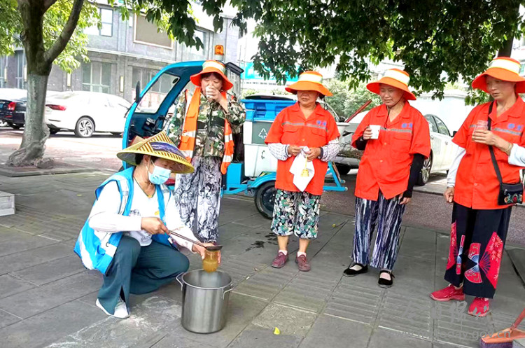“一碗绿豆汤,让我们在酷暑里备感清凉。”在中心广场的城管执法岗亭里,刚刚结束保洁任务的环卫工人罗永双喝完清凉解暑的绿豆汤时如是说。 在绵竹,共有600余名一线环卫工人一丝不苟地坚守在岗位上,用辛勤汗水扮靓这座城市,他们的作业区域分布在城市的各个主次街道。送饮用水、绿豆汤、藿香正气水等清凉饮品和防暑药品的专车每天都会在大街小巷穿梭,遇到环卫工人就会停下来,将饱含真情的绿豆汤送给他们。“天气异常炎热,我们经常会将熬制的绿豆汤等防暑降温饮品送到环卫工人手中,让他们在高温下能感到丝丝清凉。”市综合行政执法局环卫所负责人说。