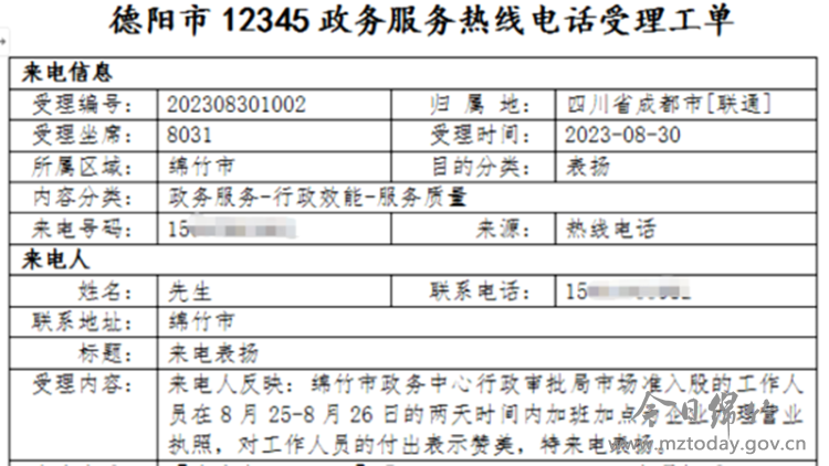 据了解,8月25日下午,市行政审批局市场准入窗口工作人员接到四川能投绵竹抽水蓄能开发有限公司经办人朱先生打来的电话,表示因公司业务问题,急需到窗口办理营业执照相关业务,且必须在8月26日内办理完,因他有事耽误了,可能会在窗口工作人员下班后才能到达现场办理。“不急,放心,你预约了我们加班也等你!”电话那头窗口工作人员的话让朱先生备感踏实。