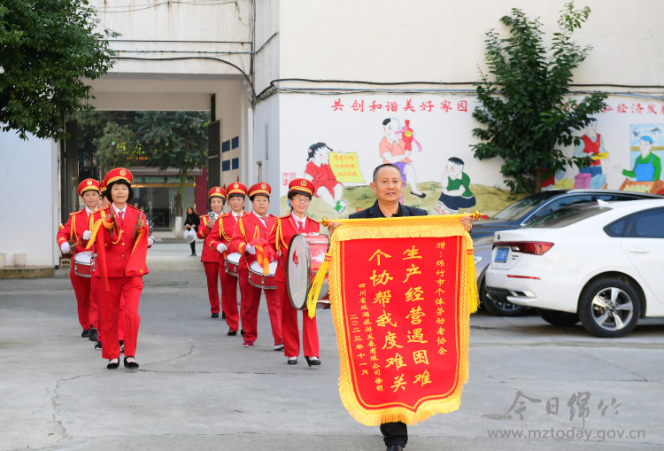 11月3日,四川省某旅游发展有限公司董事长徐明将一面写着“生产经营遇困难 个协帮我渡难关”的锦旗送到绵竹市个体劳动者协会,真诚感谢个协的优质服务,帮助他解决了燃眉之急。