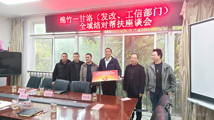 座谈会上,市发改局、工信局一行为甘洛县发展改革和经济信息化局捐赠了对口帮扶资金20000元。双方还就发改、经信系统重点项目储备与推进、产业发展、园区建设、粮食收储、党建引领等方面的工作理念和经验做法进行了交流。 市发改局、工信局相关负责人表示,在今后的帮扶工作中,将拓展帮扶领域,丰富帮扶内容,创新帮扶方式,继续在智力支持、产业发展等方面加大对口帮扶力度。同时,引导绵竹有关企业与甘洛县在更大范围、更宽领域开展深入合作,实现双方优势互补、资源共享,进一步巩固拓展甘洛县脱贫攻坚成果,推进乡村振兴和经济社会高质量发展。