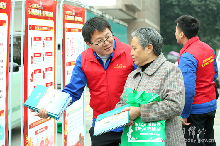 12月4日,在绵竹中心广场,志愿者们通过摆放展板、发放普法小手册、纪念品等方式,向市民宣传了宪法、电力法、民法典中关于供用电的相关规定和《电力设施保护条例》等法律法规知识。同时,还用普法小故事将与群众生活息息相关的电力法律知识进行了讲解。通过正面引导、宣传讲解、劝诫警示,增强市民对保护电力设施、维护电网安全的自觉性,构建“保护电力设施维护供用电秩序人人有责”的氛围。