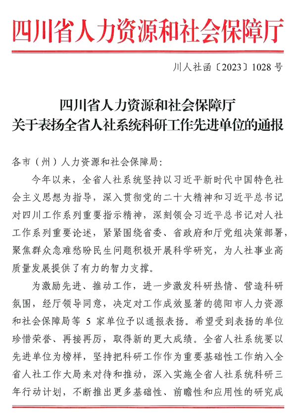 去年以来,市人社局坚持以习近平新时代中国特色社会主义思想为指导,深入贯彻党的二十大精神和习近平总书记对四川工作系列重要指示精神,深刻领会习近平总书记对社会保障工作作出的系列重要论述,紧紧围绕省委、省政府和省人社厅决策部署,聚焦群众急难愁盼民生问题积极开展科学研究,为人社事业高质量发展提供了有力的智力支撑。 市人社局将以此次荣誉为契机,坚持把科研工作摆在重要位置,准确把握保障和改善民生、助推经济社会发展的职能定位,不断推出更多基础性、前瞻性和应用性的研究成果,在推动人社事业创新发展中再创佳绩。