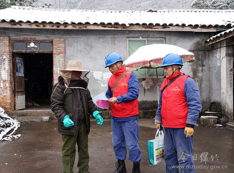 经过半小时的攀爬,三人来到了距离杆塔最近的观察区,他们的衣领上落了一层厚厚的雪粒子,额头上冒着汗珠。张永泉对杆基有无滑坡、导线覆冰等情况进行了详细排查,对周边倒伏的树竹及时清砍,确保电网“主动脉”可靠运行。 临近中午,巡线任务结束,他们又走进村民家中,对线路和用电安全进行检查宣传。 “虽然巡线很辛苦,但只要想到我们的工作能为千家万户带来光明和温暖,再累也值得。”梁贵华说,他们将密切跟踪天气变化趋势,提前做好恶劣天气情况下的保供电、保供暖、保运行措施, 全力减轻低温雨雪冰冻天气带来的不利影响,确保电力可靠供应,群众温暖过冬。