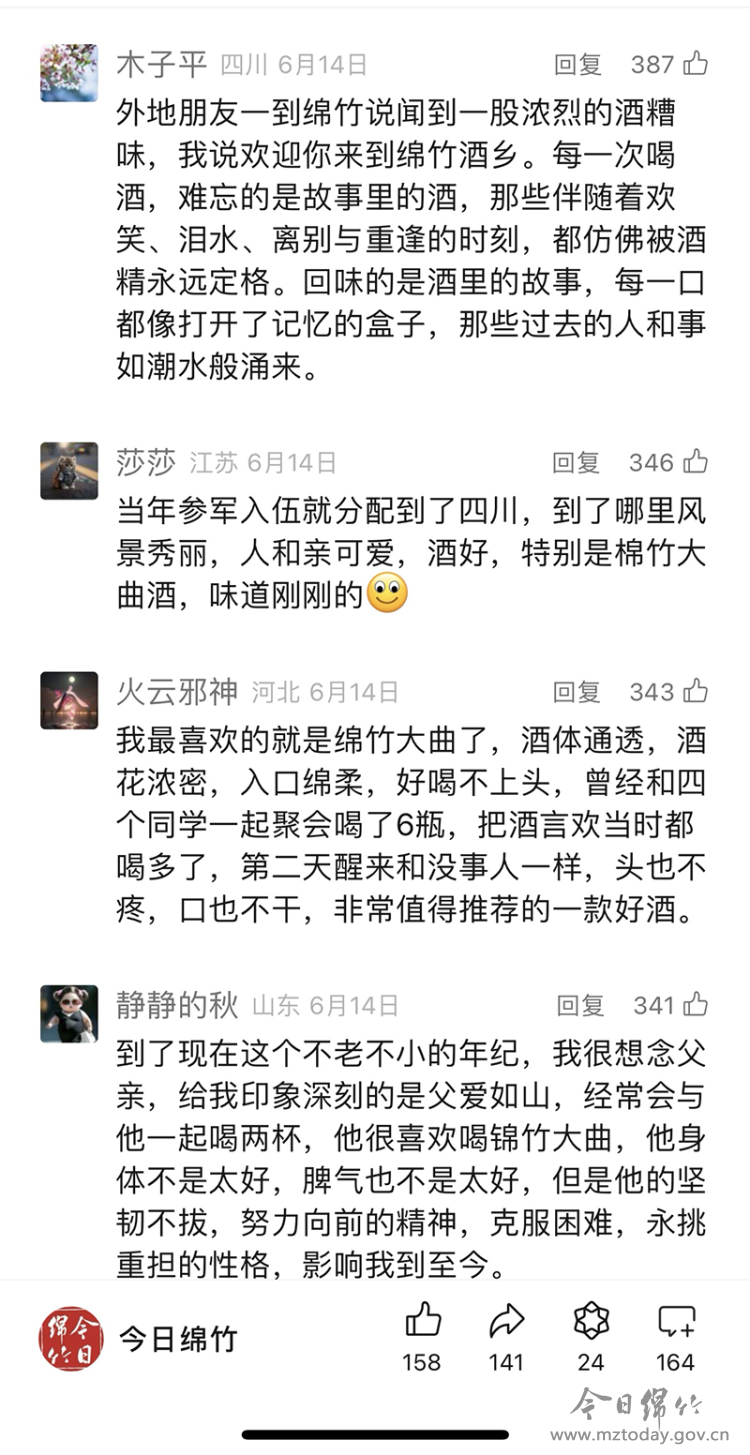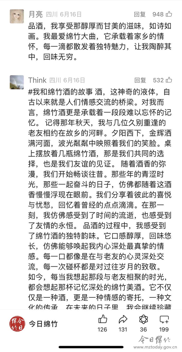 6月17日至6月21日,“剑南春老酒”杯绵竹酒“影”随手拍活动在“画境绵竹”客户端推出后,吸引了广大网友积极参与,共征集作品235件,总浏览量超过17万。“今日绵竹”微信公众号陆续发布“酿好酒、敬生活”“说酒事赢绵竹美酒”以及《今天,绵竹向全世界发出邀请》《猜“非”同“遗”般的绵竹酒!看你知道几个?》等酒博会相关推文6条,宣传绵竹千年的酿酒历史与传统技艺,对酒博会活动进行预热。其中,“说酒事赢绵竹美酒”分5期发布推文,平均每期留言超500条。反映绵竹酒文化、年画文化和茶文化的音乐MV《一纸风韵 绵竹万象》AI动画原创作品在“今日绵竹”视频号发布,播放量超2万,点赞超2000。活动期间,《今日绵竹》微信公众号新增粉丝2000,《画境绵竹》客户端新增下载量超2万,真正实现了全媒体传播绵竹酒美名、多渠道推介绵竹酒品牌、全方位展示绵竹酒形象、多元化讲好绵竹酒故事,进一步擦亮“美酒名城 画境绵竹”金字招牌,助推绵竹酒加速走向世界。 |
