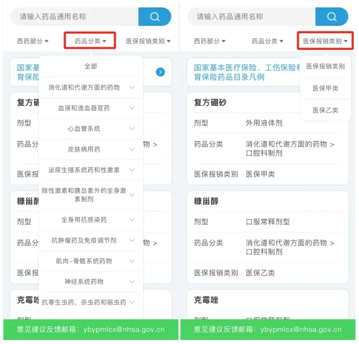 也可以根据自己的需求,选择“药品分类”或“医保报销类别”进行筛选。