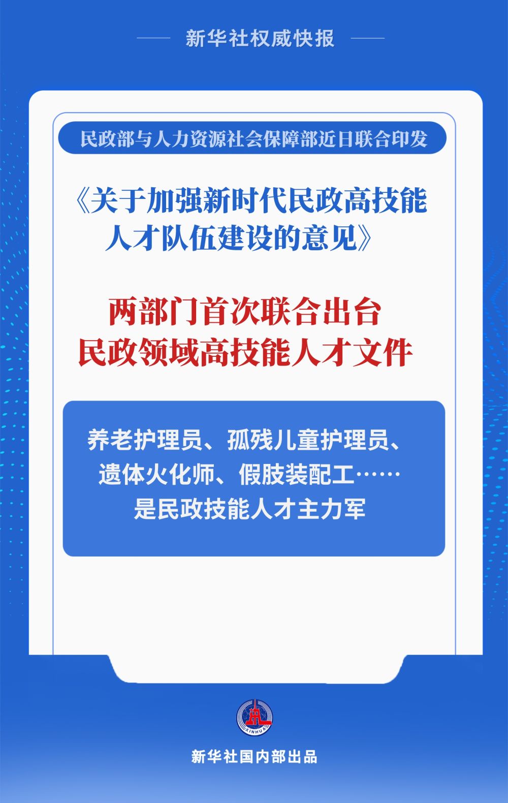 14日,《关于加强新时代民政高技能人才队伍建设的意见》对外发布,这是民政部、人力资源社会保障部首次联合出台的民政领域高技能人才文件,剑指民政技能人才队伍短板,就人才培养、使用、评价、激励等方面作出制度性安排。