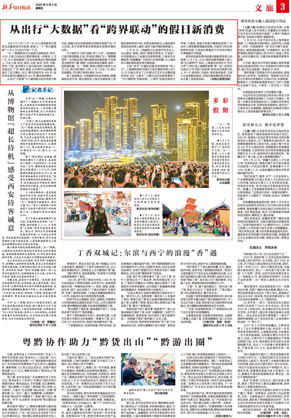 来源:5月4日《新华每日电讯》 作者:新华每日电讯记者贾远琨 426.8万人次!5月1日,长三角铁路单日旅客发送量再创历史新高,距离上一个“单日最高峰”(4月4日)仅仅不到一个月。 “五一”假期跨省中长途旅行选择很多,其中,1500公里以内的出行需求得到进一步释放。5月1日,长三角铁路部门在启用高峰运行图的基础上,不论上海、杭州、南京、合肥、扬州、苏州、无锡、常州、宁波、温州等长三角区域内热门旅游城市,还是北京、广州、福州、南昌、长沙等中长途线路,都进行了运力增补。当天,增开旅客列车469列、组织动车组列车重联运行424列,满足旅客需求。 5月1日,河南省洛阳市老城区丽景门游人如织。新华社发(李卫超摄) 从出行“大数据”可以看到假日经济热度不断升温,细细分析这些数据背后的特色旅游产品,可以发现,其中有跨界联动营销激发消费热情的功劳。 不少城市为了吸引游客“来了又来”,与铁路部门进行联动营销。比如,苏州吴江推出“五一”假期期间凭7日内抵达吴江境内高铁站的高铁票,可在黎里古镇享受门票、购物、住宿和美食优惠等,迎来一波旅游热潮。“五一”假期,黎里古镇预计接待8.49万人次,预计同比增长5.2%。5月1日至4日,部分民宿满房,平均预订率同比增长28.6%。 除了旅游景点,与铁路联动的还有邮轮。随着邮轮经济升温,乘坐高铁到上海开启邮轮海上度假的游客络绎不绝,而乘坐邮轮抵达上海的国外游客也纷纷乘上高铁,感受飞驰中国的独特魅力。 4月30日,上海邮轮文化旅游节发布会上,宝山推出“邮轮+高铁”港城互联项目,计划进一步深度激活长三角地区的旅游资源,以高铁为关键纽带,构建覆盖广泛的四小时高铁圈,与上海吴淞口国际邮轮港实现无缝衔接。 文旅“牵手”交通的创意还将博物馆“带上天”。上海博物馆和中国东方航空集团有限公司4月30日联合发布了以中国古代艺术为主题的宽体彩绘飞机“上博号”,为假日出行的旅客增添了“空中博物馆”的新体验。“上博号”机舱内部的行李架、小桌板、座椅头垫等位置甄选呈现了30余件上博馆藏青铜器的图案,并配有文物说明和特色纹饰,令旅客仿佛置身于空中的中国古代青铜器艺术特展。 5月1日晚,游人在上海静安公园观赏光影秀。新华社记者 刘颖 摄 更好的创意和更优的服务就能带来更火的消费。5月2日,2025国际消费季暨第六届上海“五五购物节”启动,上海浦东机场作为“空中口岸”力争打造上海精彩消费“第一站”。机场作为航空公司与商户的纽带,将机场内消费与机上Wi-Fi使用券、升舱券、贵宾室体验券、文创小礼品等联动起来,实现空港消费的相互带动,也丰富了旅客的体验。 |