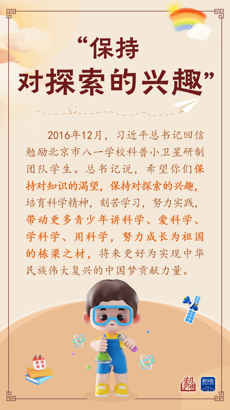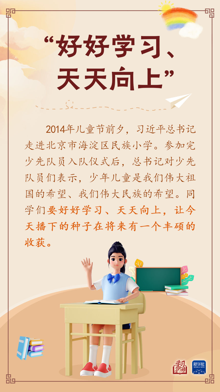 少年强则国强,少年兴则国兴。少年儿童是推进强国建设、民族复兴伟业的未来生力军。 让孩子们成长得更好,习近平总书记始终牵挂于心。本期“学习新语”,我们撷取总书记关心少年儿童健康成长的一些场景,感悟总书记对“祖国花朵”的真挚关怀和殷切期望。