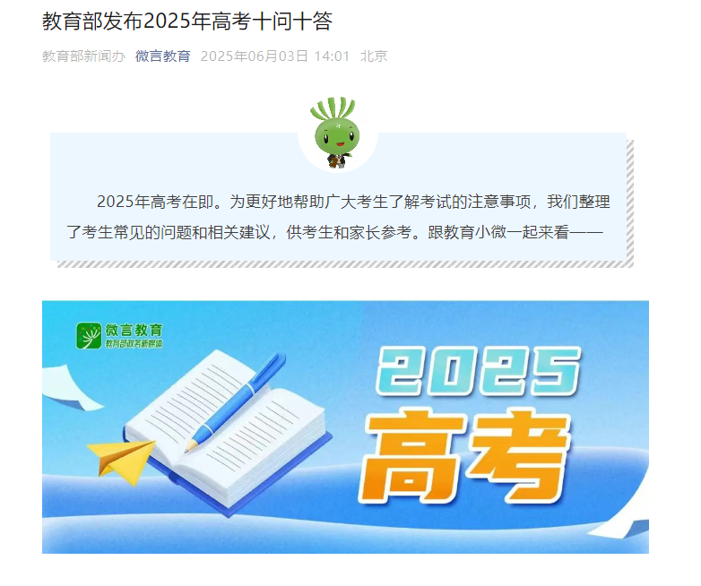 2025年高考在即。为更好地帮助广大考生了解考试的注意事项,我们整理了考生常见的问题和相关建议,供考生和家长参考。跟教育小微一起来看—— 1 考生应如何规划赴考行程? 考前,请考生认真阅读、仔细核对考试时间、考点信息、考生须知等内容。特别是要牢记考试时间、考点位置、考场编号,同时结合考点考场位置、天气及交通等情况,合理安排交通工具,合理规划行程路线。 考试当天按要求提前到达考点,留足进入考点考场身份验证和安检的时间。出现紧急交通状况时,可就近向交通警察寻求帮助。 2 考生的衣着穿戴有什么需要注意的? 考生的衣着要符合当地招生考试机构的相关要求,建议不佩戴含有金属成分的手镯、项链、发夹等佩饰物品。同时,应根据当地的天气状况,注意增减衣物。 3 对于考生做好个人健康防护有哪些建议? 考生要做好个人防护,当好自身健康第一责任人。考前尽量减少聚集和流动,不去人员密集场所。同时,调整好心理状态,保证合理的饮食、充足的睡眠、适当的身体锻炼,如有不适,要及时就医治疗,谨防因身体不适而影响考试。对于发热或者突发急病等考生,也不必担心恐慌,各地考点都制定了相应的预案。 4 赴考前需要检查哪些物品? 赴考时要记得随身携带好《准考证》和省级招生考试机构规定的有效身份证件等必要入场证件。同时,还要注意检查是否带齐省级招生考试机构规定的考试用品。自行打印《准考证》的考生,还应检查是否有《准考证》内容以外的字迹。《准考证》正、反两面在使用期间均不得涂改或书写。 5 进入考点(学校)一般有哪些要求? 进入考点时,要听从工作人员的安排,有序排队,保持一定间隔,不要将手机等违规物品带入考点。手机最好在赴考前提前存放好,也可在进入考点前交给带队老师、家长,或按照考点规定要求存放。存放、领取手机时要听从工作人员安排,保持秩序。 6 进入考场(教室)一般有哪些要求? 进入考场时,将再次进行考生身份验证和违规物品检查,除省级招生考试机构规定的考试用品外,其他物品不要带入考场。进入考场后,要对号入座,将《准考证》和省级招生考试机构规定的有效身份证件放在桌上以便核验。 7 违反考场纪律会受到怎样的处罚? 考生要遵守考场规则和纪律,服从考试工作人员管理。考试过程中,考点除有监考员、巡考员等维护考试纪律、巡查考场外,考场内已实现视频监控系统全覆盖并全程录像,不仅在考试中专人实时监控巡查,考后也会对视频录像进行必要的回放。一旦发现考生有违规或作弊行为,将按《中华人民共和国教育法》《国家教育考试违规处理办法》确定的程序和规定严肃处理,并将记入国家教育考试考生诚信档案;考试作弊将导致高考所有科目的成绩无效,并视情节轻重,给予暂停参加高考1至3年的处理,情节特别严重的,给予暂停参加各种国家教育考试1至3年的处理;涉嫌犯罪的,按照《中华人民共和国刑法》《最高人民法院 最高人民检察院关于办理组织考试作弊等刑事案件适用法律若干问题的解释》等法律规定,移送司法机关追究法律责任。在高考中组织作弊,属于《刑法》规定的“情节严重”的犯罪。 特别需要注意的是,考生如携带手机、智能手表、智能眼镜等具有发送或者接收信息功能的设备进入考场,无论使用与否,均将认定为考试作弊。考试过程中使用手机等设备拍摄试题、答题卡等,通过QQ、微信及其他网络平台发布信息、传播试题及答案,均涉嫌犯罪,将移送司法机关追究法律责任。 8 考试过程中有哪些注意事项? 考生作答时要沉着冷静,规范书写,确保字迹清楚、卷面整洁。同时按照要求在指定位置正确填涂信息、在与题号相对应的答题区域内答题,写在草稿纸上或非题号对应的答题区域的答案将是无效的,不得用规定以外的笔和纸答题,不要在答卷(答题卡)上做任何标记。考试结束信号发出后,立即停笔并停止答题。切勿将试卷、答卷(答题卡)或草稿纸带出考场。 9 网上关于高考的信息很多,如何辨别真伪? 请考生和家长认准官方网站、官方账号,涉高考信息以官方发布的为准,不要相信各类非官方宣传及承诺,以免上当受骗。 同时,不要相信所谓的“命题专家”的言论,更不要把宝贵的时间和精力浪费在所谓的“猜题”和“押题”上,切勿相信涉及钱财的相关信息。请考生和家长弘扬正能量,不造谣、不信谣、不传谣,共同营造风清气正、温馨和谐的考试环境,共同维护高考的公平公正。 10 考后应如何查分及获取志愿填报服务? 考后,各省级招生考试机构均会公布高考成绩发布时间及官方查询的渠道,请考生和家长关注相关权威发布信息。 为进一步加强对考生的志愿填报服务,2025年,教育部“阳光高考”平台及“阳光志愿”信息服务系统将优化升级,各省也将建立完善本地志愿填报服务信息平台和系统,努力为考生提供更加优质、更加便捷、更加全面的信息服务。同时,教育部将组织各地各高校举办“2025年全国普通高等学校招生云咨询周”活动,为考生和家长提供志愿填报咨询服务。各地各高校还将通过宣讲会、咨询会、短视频、网络直播、电视节目等多种方式组织开展系列志愿填报咨询服务活动,请考生和家长关注。 考生和家长如还有其他具体问题 ,可向当地的招生考试机构及学校咨询。 微信公众号截图