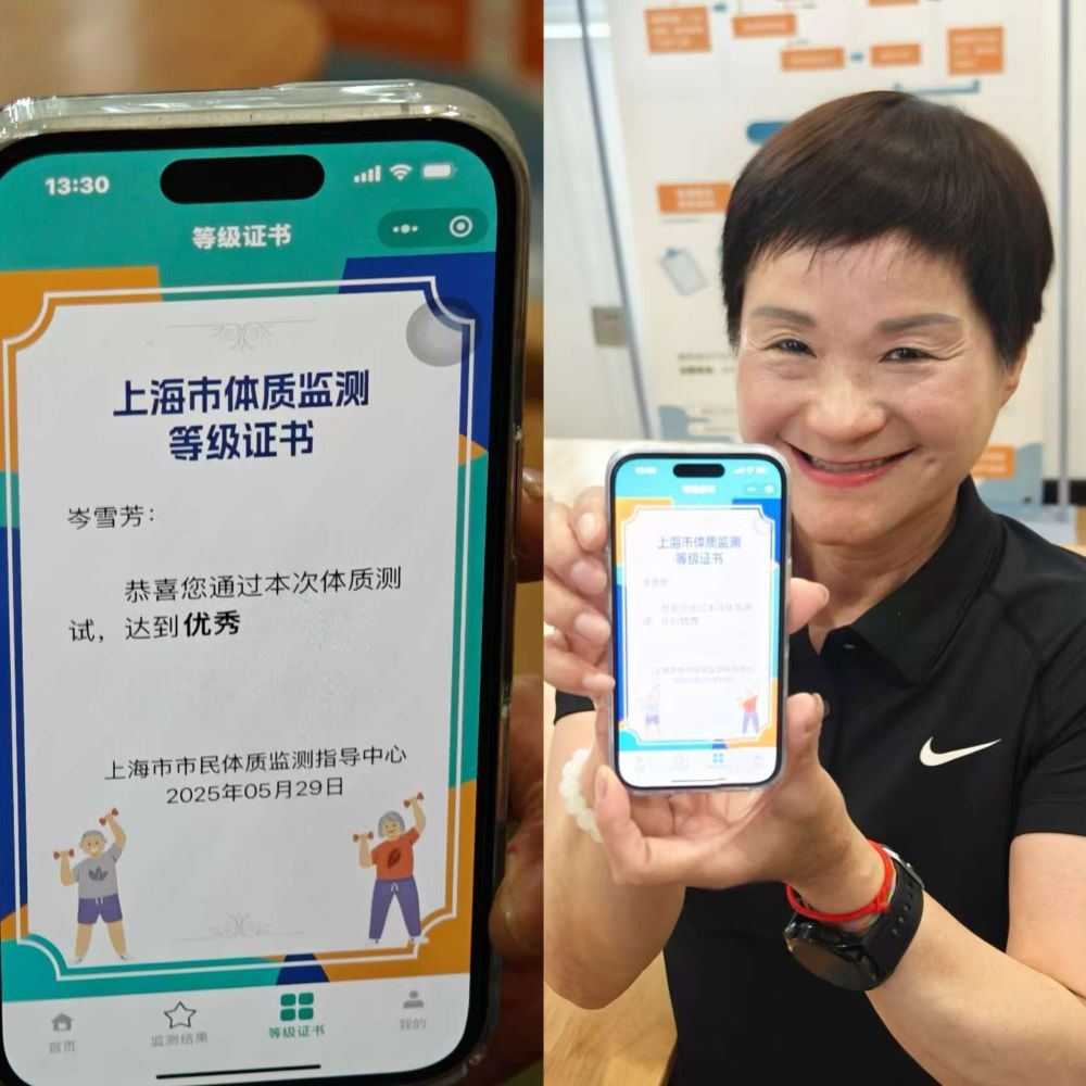 岑雪芳展示“上海市体质监测等级证书”。