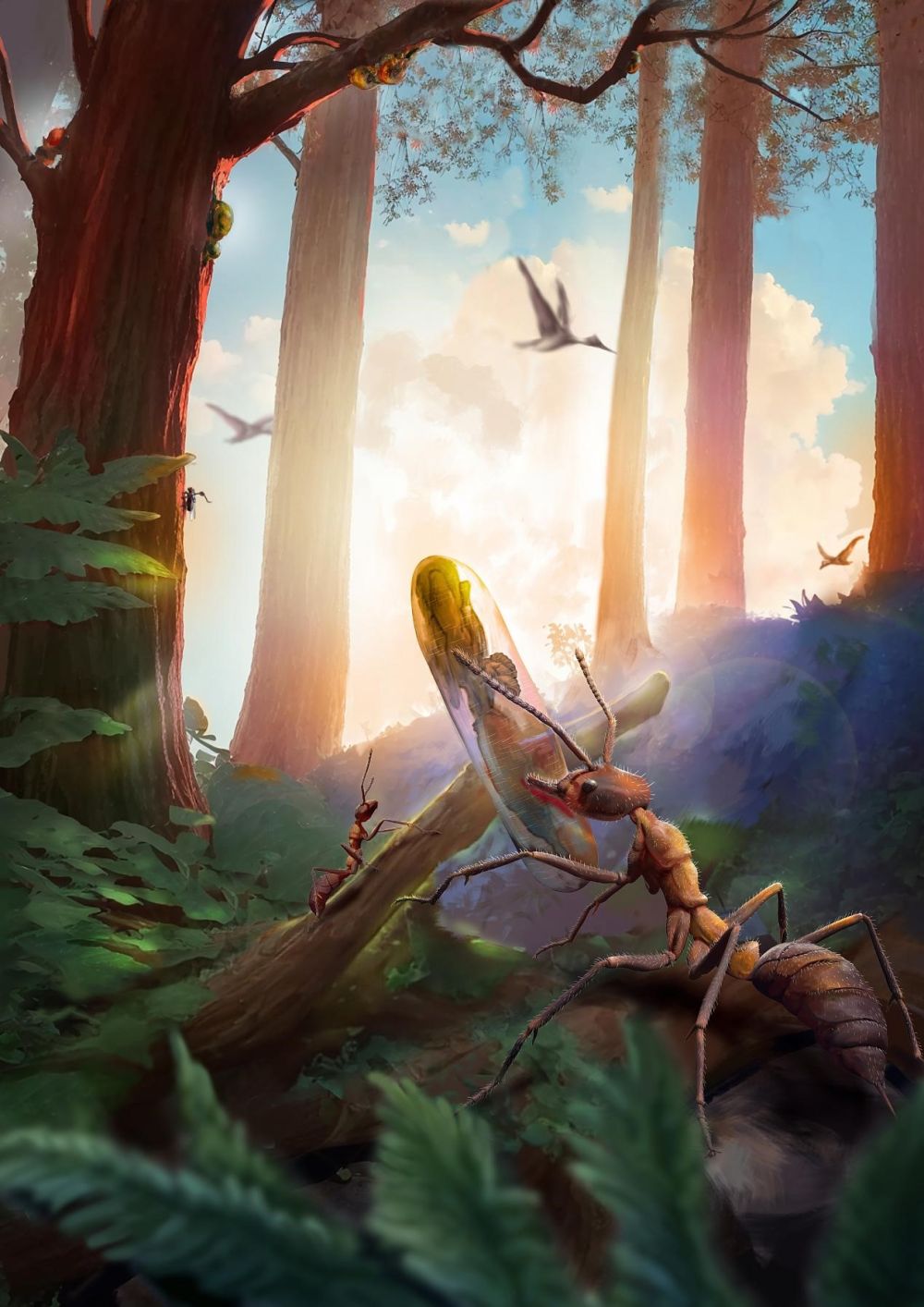 白垩纪时期蚂蚁、蝇类与古线虫草的古生态重建图。(中国科学院南京地质古生物研究所供图 杨定华绘制)