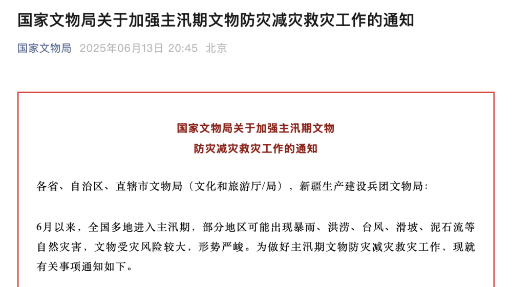 当前,全国多地进入主汛期。记者6月13日从国家文物局获悉,为做好主汛期文物防灾减灾救灾工作,国家文物局发出通知,要求各级文物行政部门和文博单位进一步对接当地气象、水利等部门,提升文物受灾风险预警能力,会同相关部门将防灾措施做到前头,落到实处。