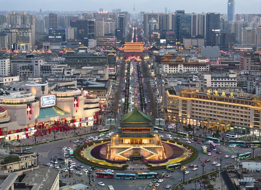 3月19日,空中俯瞰西安钟楼、南门商圈(无人机照片)。陕西省西安市是古丝绸之路的起点,自古以来便是商贸往来的重要枢纽。新华社记者邵瑞摄